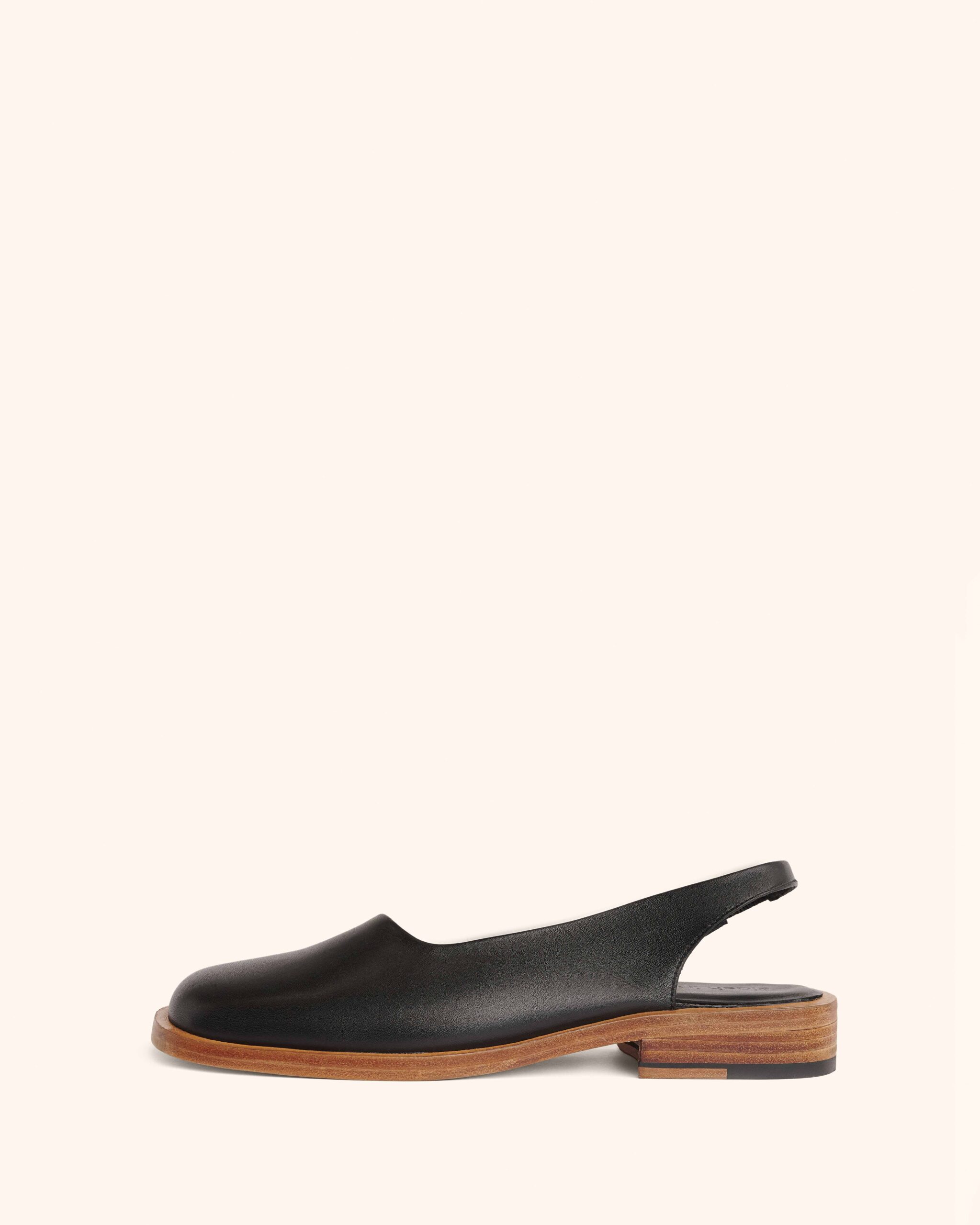 A squared-toe slingback mule with a continuous topline, an all-round plain welt and elastic detailing on the backstrap. Set on a 1.25-inch block heel finished with an ultra-flexible Argentinian leather sole.